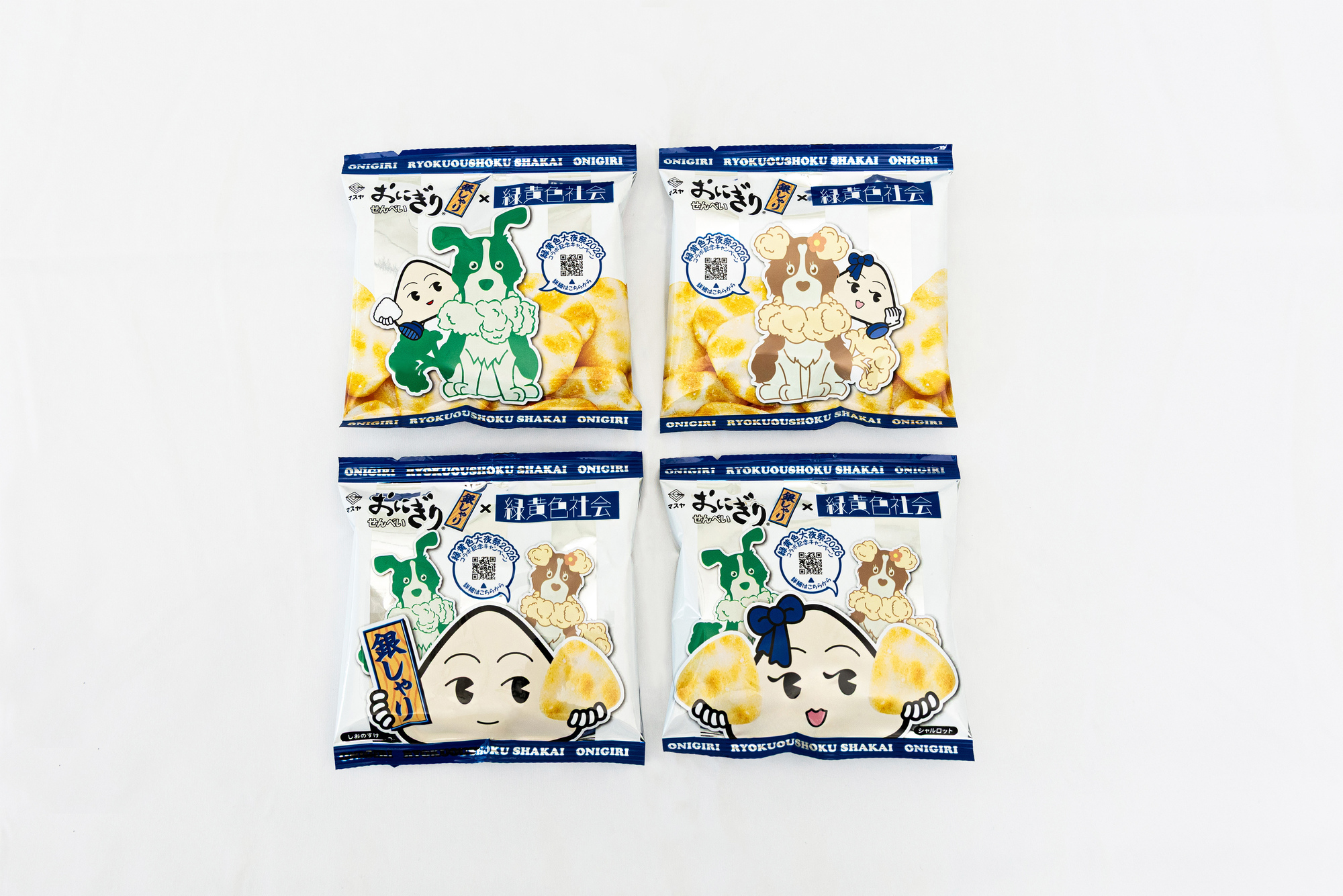 緑黄色社会のマスコットキャラクター「ブロッコリー」&「カリフラワー」と、おにぎりせんべい銀しゃりのマスコットキャラクター「しおのすけ」&「シャルロット」が共演した、かわいらしいパッケージです。